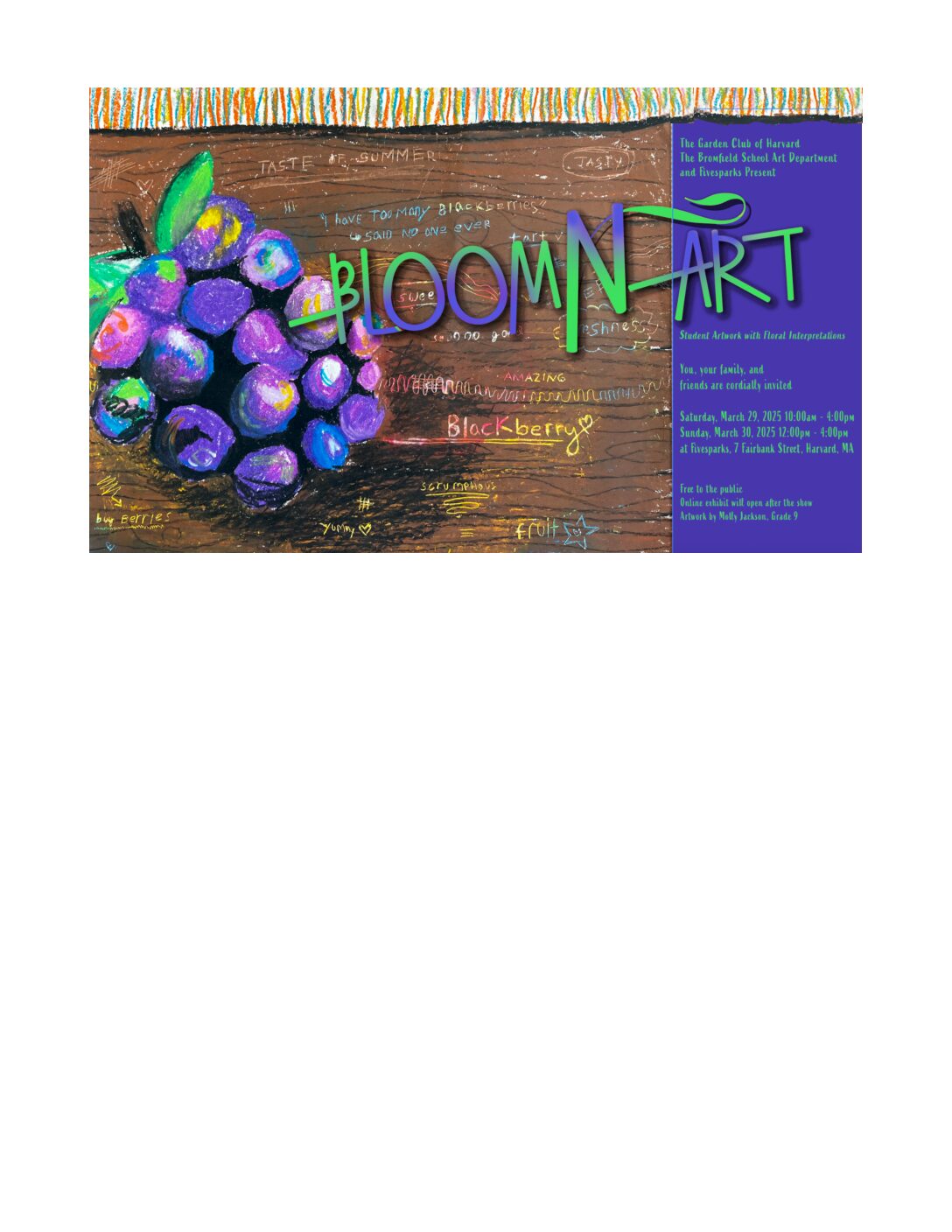 In partnership with the Bromfield School Art Department and Fivesparks, the Garden Club of Harvard is proud to present its 9th annual Bloom N Art show.