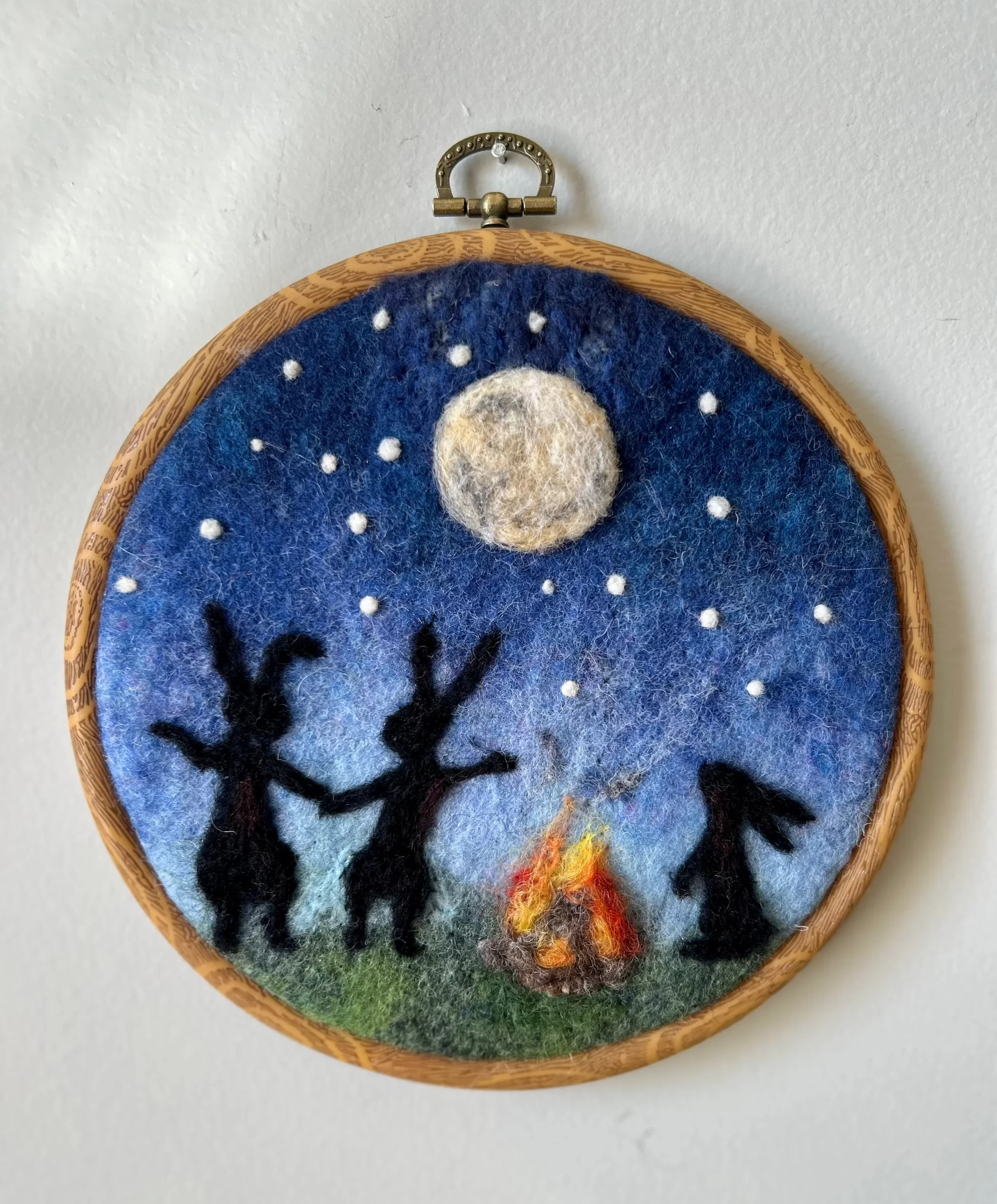 In class one you will learn how to ‘paint’ with wool to create a 2D scene of rabbits dancing around a fire. In class