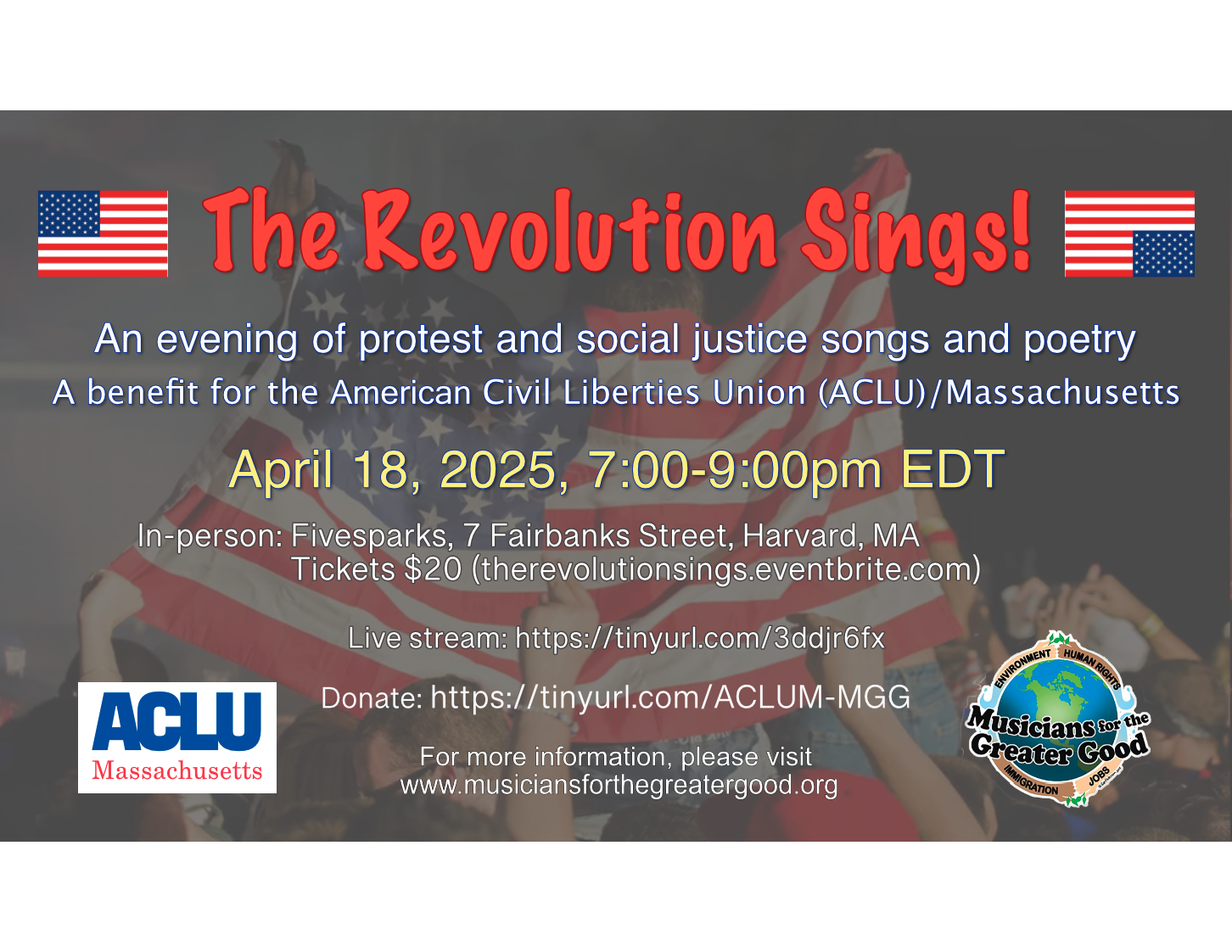 The Live Stream will be available starting at 7:00 PM Friday the 18th at https://tinyurl.com/3ddjr6fx. Donations can be made at the following link https://tinyurl.com/ACLUM-MGG